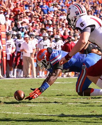In the second quarter – after several Florida defensive penalties helped the Gamecocks stop the bleeding – USC coughed up the ball on back-to-back kick returns. First, USC’s star punt returner Ace Sanders was stripped while returning a Kyle Christy punt midway through the second quarter – which the Gators quickly turned into a 14-3 lead. On the ensuing kickoff, Damiere Byrd fumbled – setting the Gators up with a first-and-goal from the USC one-yard line. Two plays later it was 21-3 Florida – despite the fact that the Gators only accumulated 29 yards of total offense in the first half.