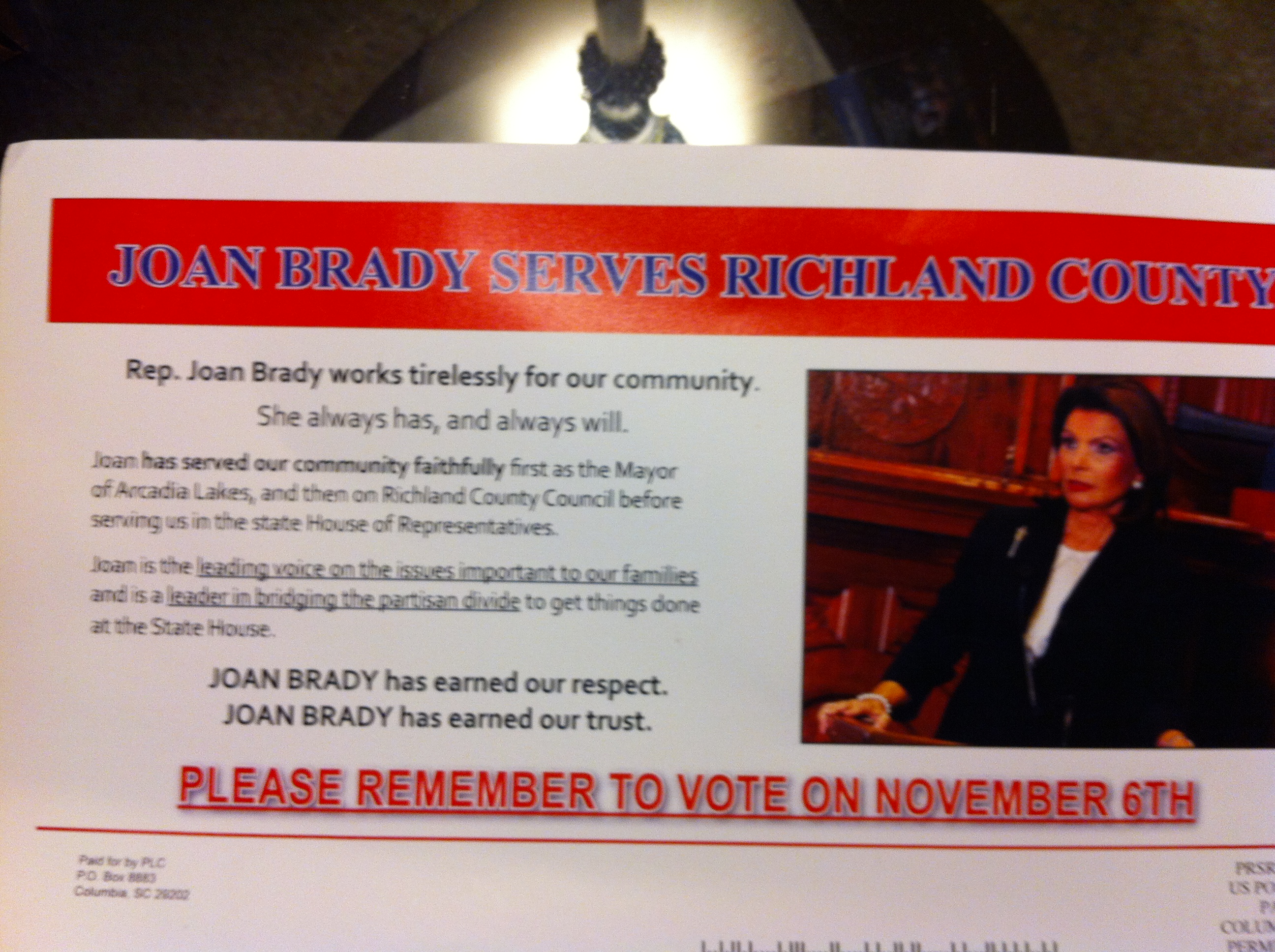 Harrell’s Palmetto Leadership Council – a political action committee – ran a mailing in Richland County recently with the goal of bolstering the sagging reelection prospects of S.C. Rep. Joan Brady (RINO-Columbia). Brady is currently facing an especially strong reelection challenge from Democrat Beth Bernstein, a proponent of ethics reform.