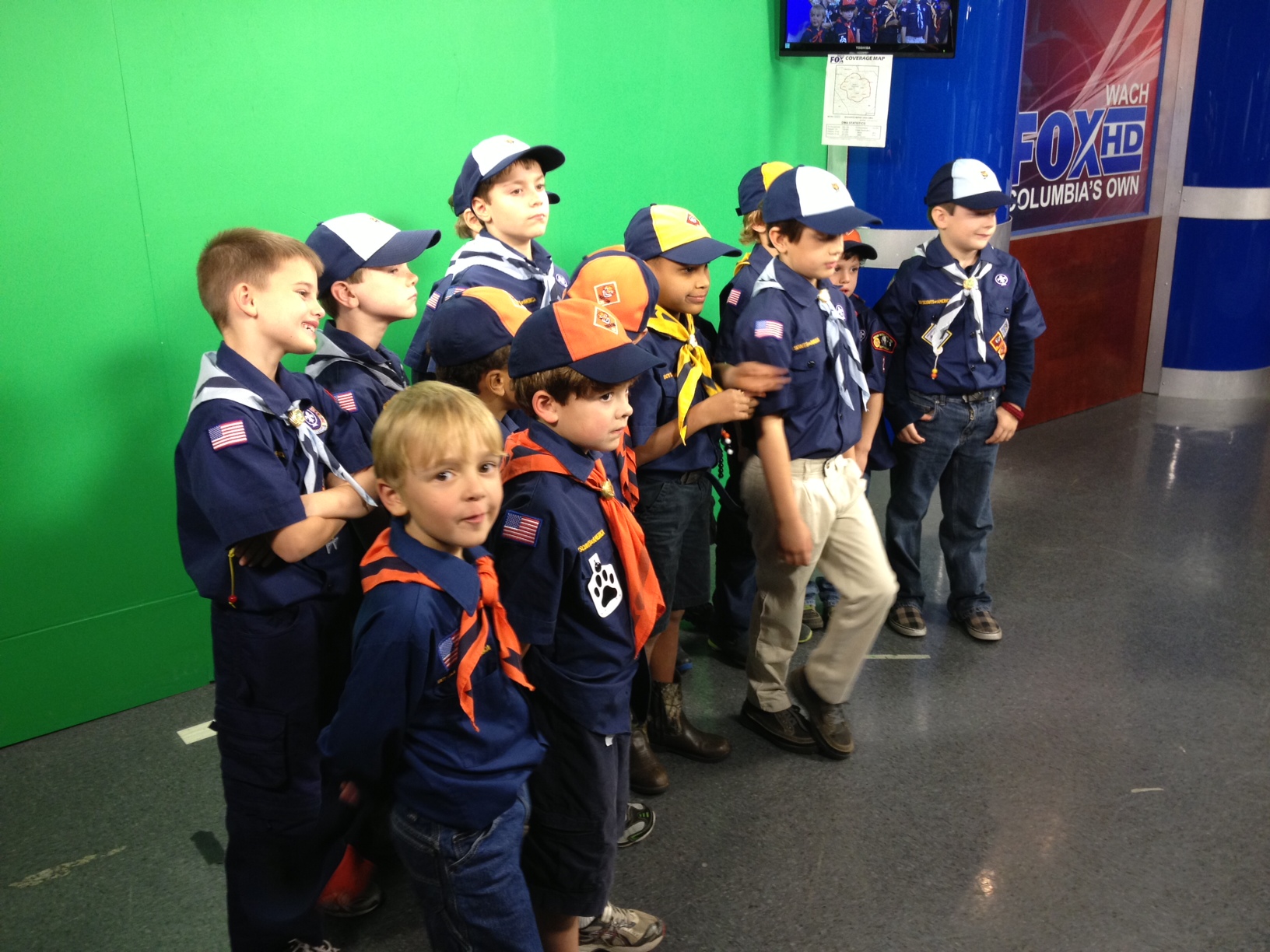 On less than 24 hours notice, the good folks at WACH TV 57 (Fox – Columbia, S.C.) were kind enough to welcome a small army of Cub Scouts from the Indian Waters Council of the Boy Scouts of America (BSA) this week. Led by the station’s chief meteorologist Henry Rothenberg, WACH employees rolled out the red carpet for about two dozen Tiger, Wolf and Bear scouts (grades 1-3) – kids who hold den meetings each week at nearby First Presbyterian Church in downtown Columbia, S.C.
