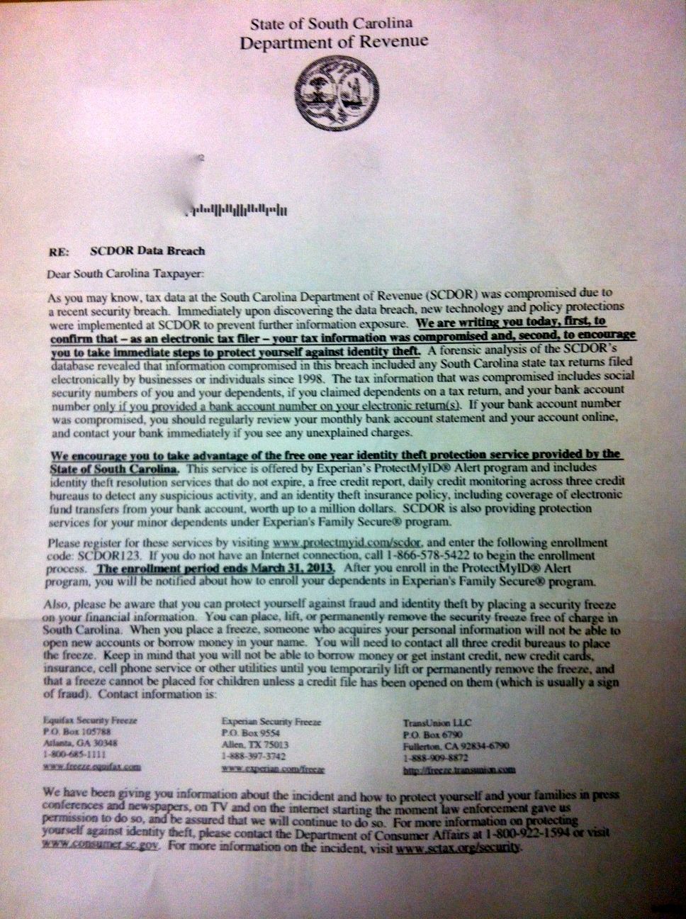 In viewing the #SCHacked letter you posted, I couldn’t help but notice something. Every letter sent by (the S.C. Department of Revenue) goes out on a letterhead with “Nikki Haley – Governor” on it … EXCEPT for this one. Does the governor really think we’ll forget she’s in charge of this agency?