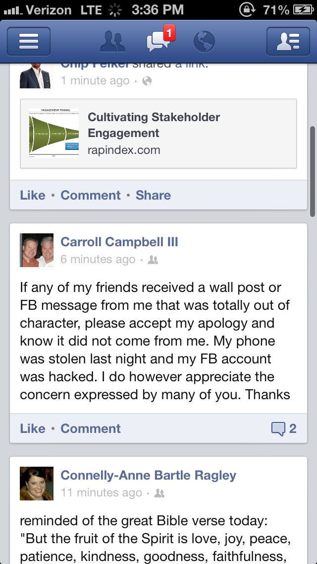 “If any of my friends received a wall post or FB message from me that was totally out of character, please accept my apology and know it did not come from me,” he writes. “My phone was stolen last night and my FB account was hacked. I do however appreciate the concern expressed by many of you. Thanks.”