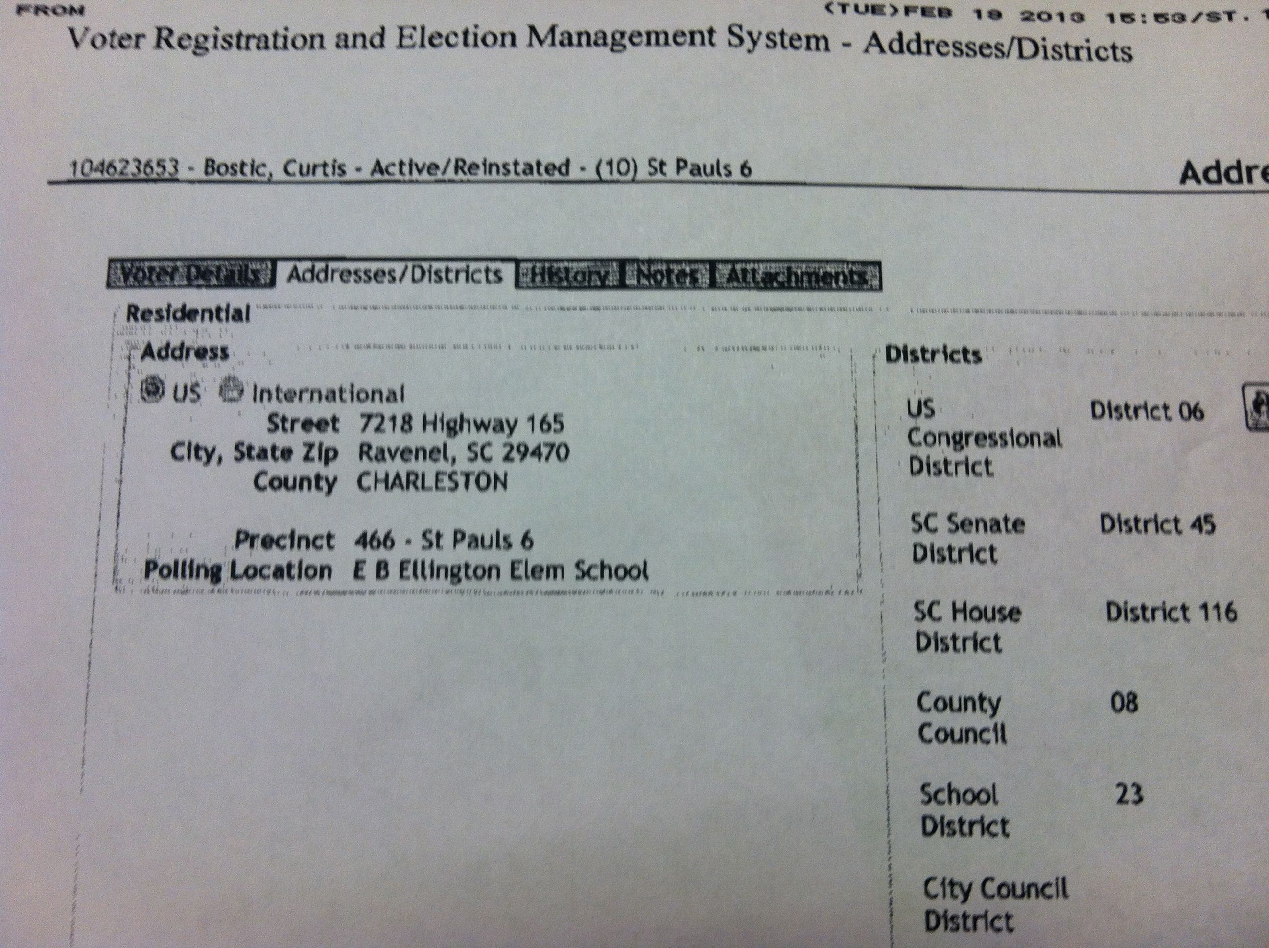 UPDATE: Curtis Bostic has responded to our report: “My residence is not in the first district,” he confirms in an email to FITS. “The Constitution does not require one have residency in the district but in the state.”