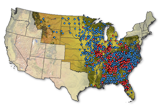 Curiosity got the better of me. According to Hardee’s website, the red dots are the locations that do the “Red Burrito” stuff.