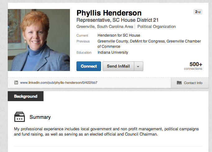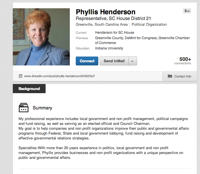 Earlier this week we published an item on S.C. Rep. Phyllis Henderson, who bragged on her LinkedIn profile about helping companies and nonprofits with “Federal, State and local government lobbying,” among other services.