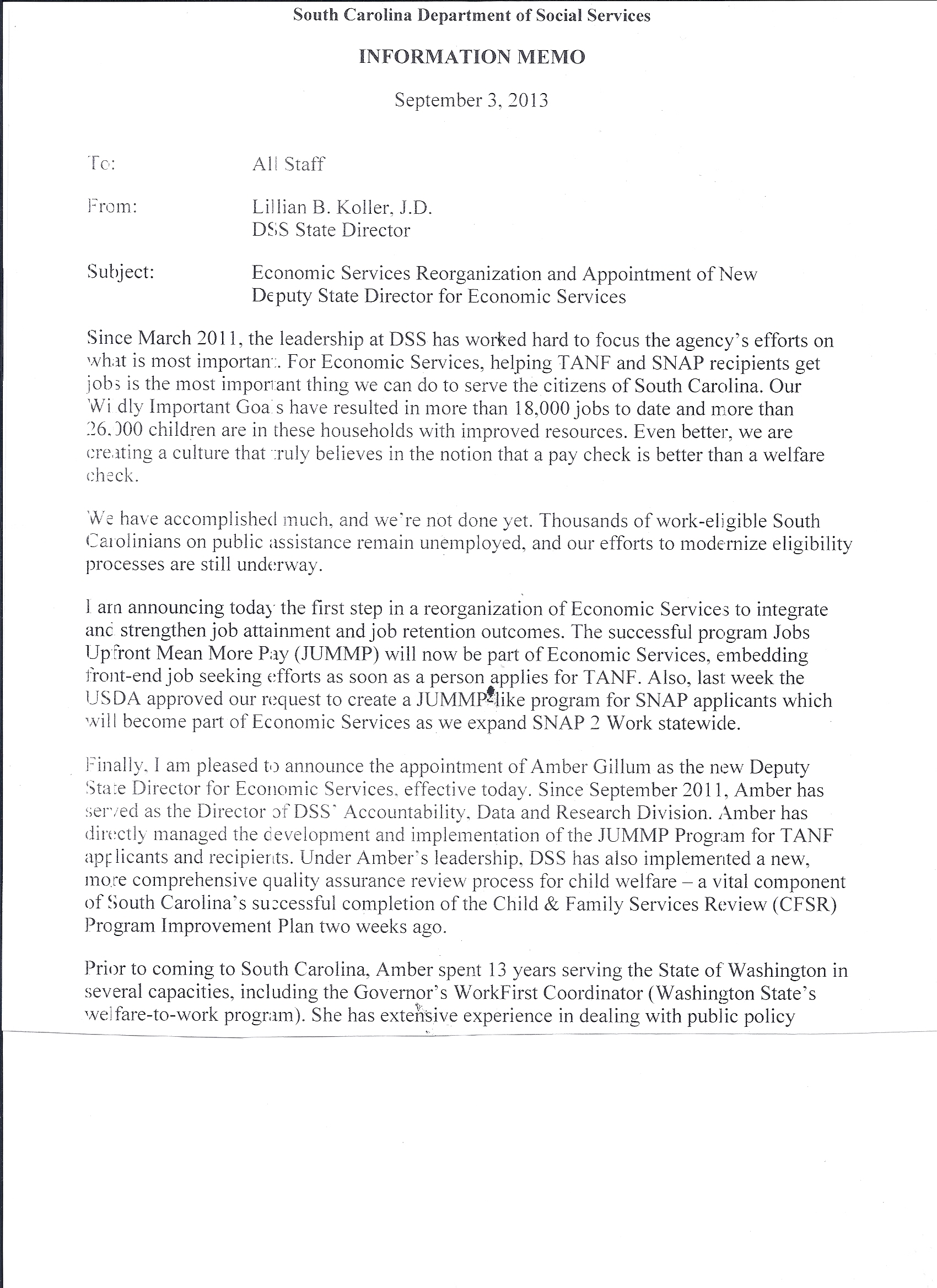 According to the memo from S.C. Department of Social Services (SCDSS) director Lillian Koller, her firing of longtime deputy director Linda Martin was part of an internal “reorganization” designed to better “integrate and strengthen job attainment and job retention outcomes.”
