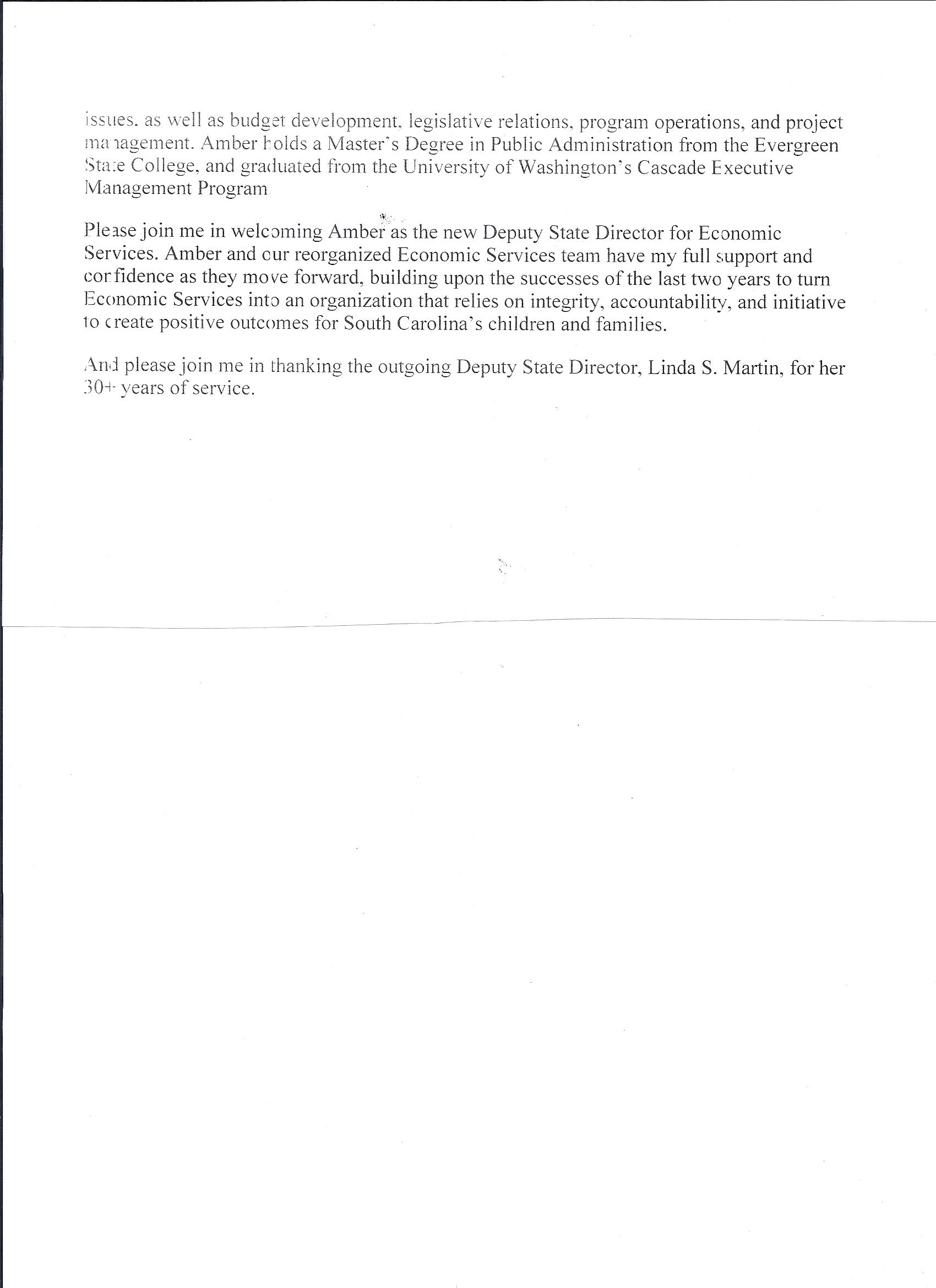 “Prior to coming to South Carolina, Amber spent 13 years serving the state of Washington in several capacities, including the Governor’s WorkFirst coordinator (Washington State’s welfare-to-work program),” Koller wrote.