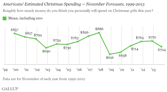 American consumers plan on spending an average of $704 on holiday gifts this season – down from $770 a year ago (and down from $886 in 2008).