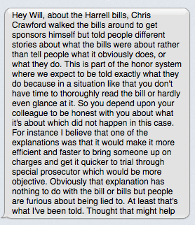Anyway, as it relates to Harrell’s efforts to neuter the Attorney General’s ability to prosecute public corruption, it seems as though several lawmakers were lied to about the bills being pushed by Harrell.