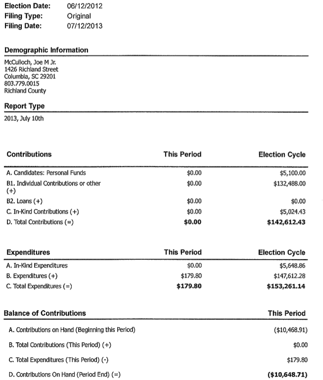 For those of you keeping score at home, negative balances on campaign disclosures are not permitted – resulting in the S.C. State Ethics Commission (SCSEC) flagging the report and sending a warning letter to the candidate in question.