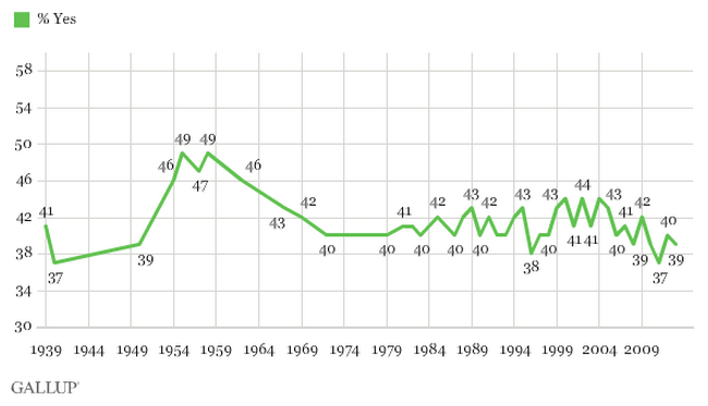 This metric – which most researchers believe to be slightly overstated by respondents – has nonetheless remained remarkable constant over the past half century. After topping out at 49 percent in 1955 (and again in 1958), religious participation plunged to 40 percent by the early 1970s.