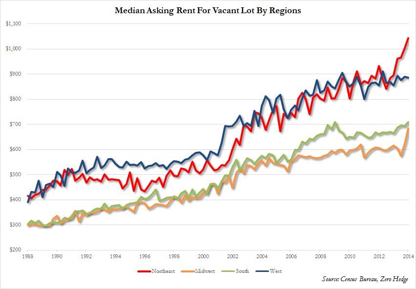 “Americans have to live somewhere,” Zero Hedge notes. “That somewhere is as renters of Wall Street and other landlords. As the next chart shows, the median asking rent has soared to fresh records and hitting an all time high of $766 as of the first quarter.”