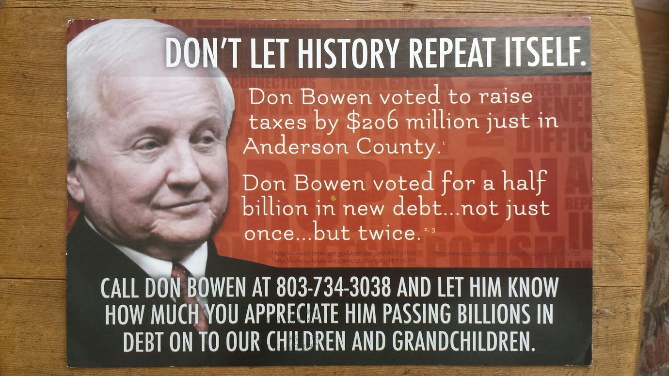 “This is what beat Don Bowen,” one veteran Anderson politico told FITS, referring to a mail piece (above) touting his support of a local option sales tax increase currently making its way through the S.C. General Assembly.
