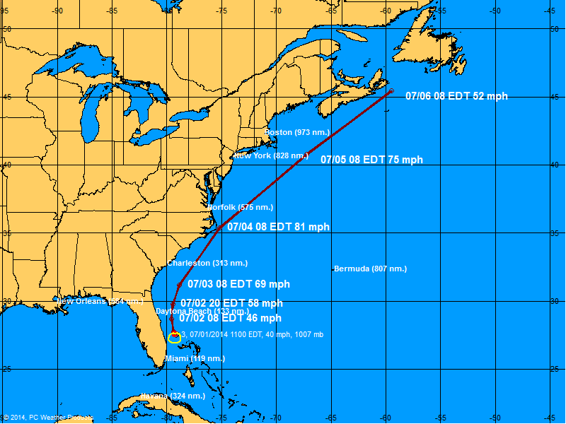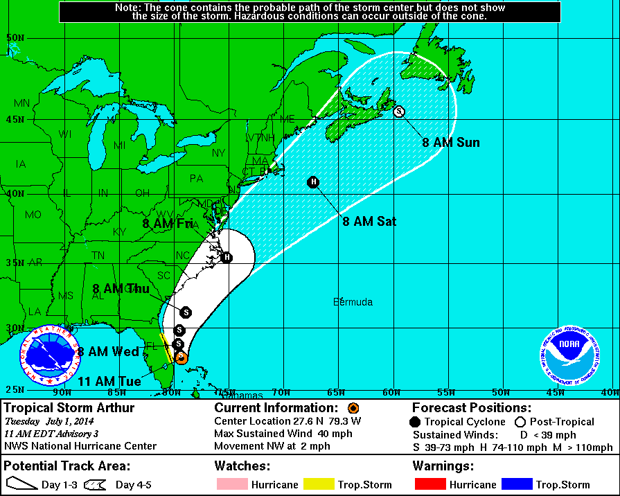 Anyway, the first named storm of the 2014 season – “Arthur” – has formed off the coast of Florida. The system is currently packing maximum sustained winds of only 41 miles per hour, but is expected to strengthen as it moves up the Eastern Seaboard.