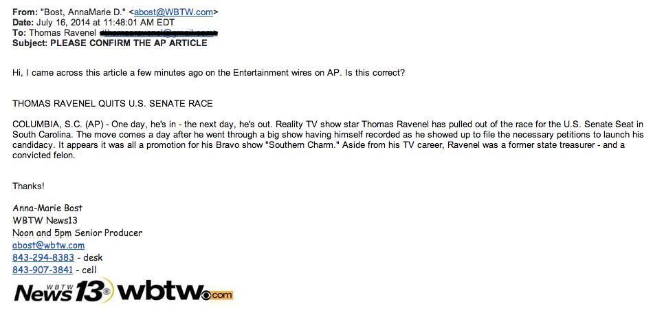 Television stations in Columbia, Spartanburg and Charleston also confirmed receiving the “wire,” with several of them contacting the Ravenel campaign for comment.