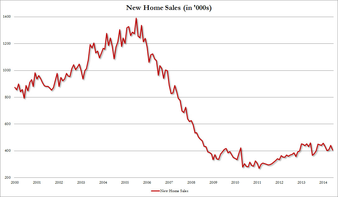 Last week new home sales data was released – showing a 20 percent month-to-month drop (from 504,000 to 406,000 units). Of course data from May, April and March was revised downward (by a total of nearly 80,000 units).