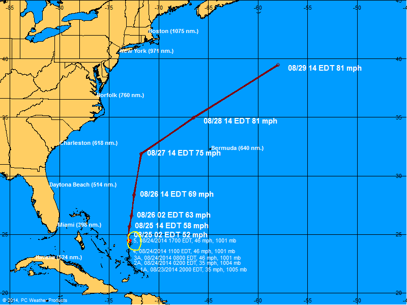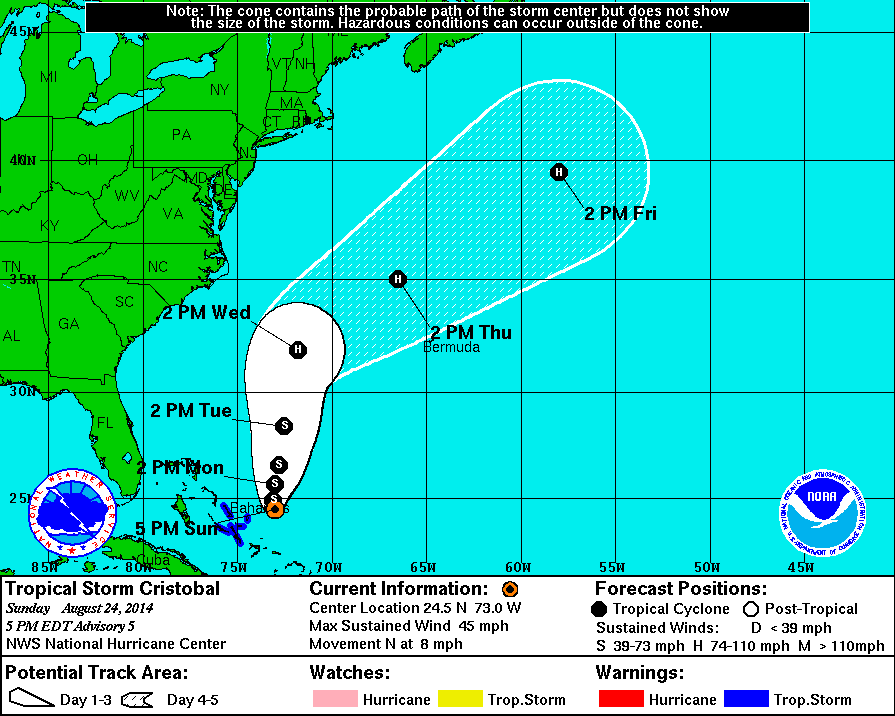 Tropical Storm Cristobal – the third named system of a quiet 2014 hurricane season (so far) – formed near the Bahamas early Sunday. The storm is expected to become a hurricane within the next 72 hours, although current forecast tracks have it steering well clear of the Eastern Seaboard.