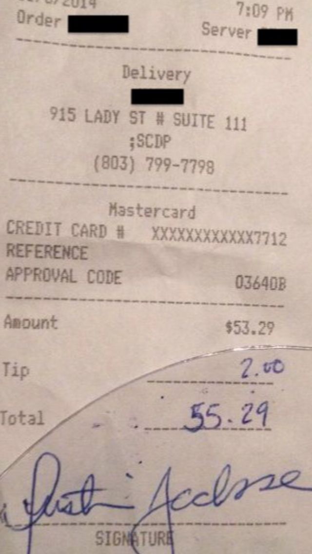 Here’s a receipt from a pizza order delivered to the S.C. Democratic Party on election eve … looks like the party of the little man didn’t leave much of a tip to this particular delivery guy.