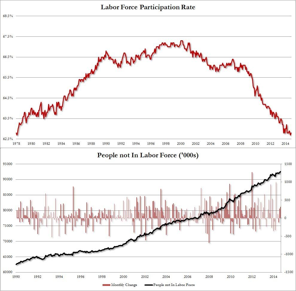 First, according to the U.S. Bureau of Labor Statistics (BLS), the nation’s unemployment rate dropped to 5.8 percent in October, although as we’ve pointed out repeatedly the real metric to watch in assessing the jobs market is the labor participation rate, which shows what percentage of our country’s working age population is either employed or actively looking for work.