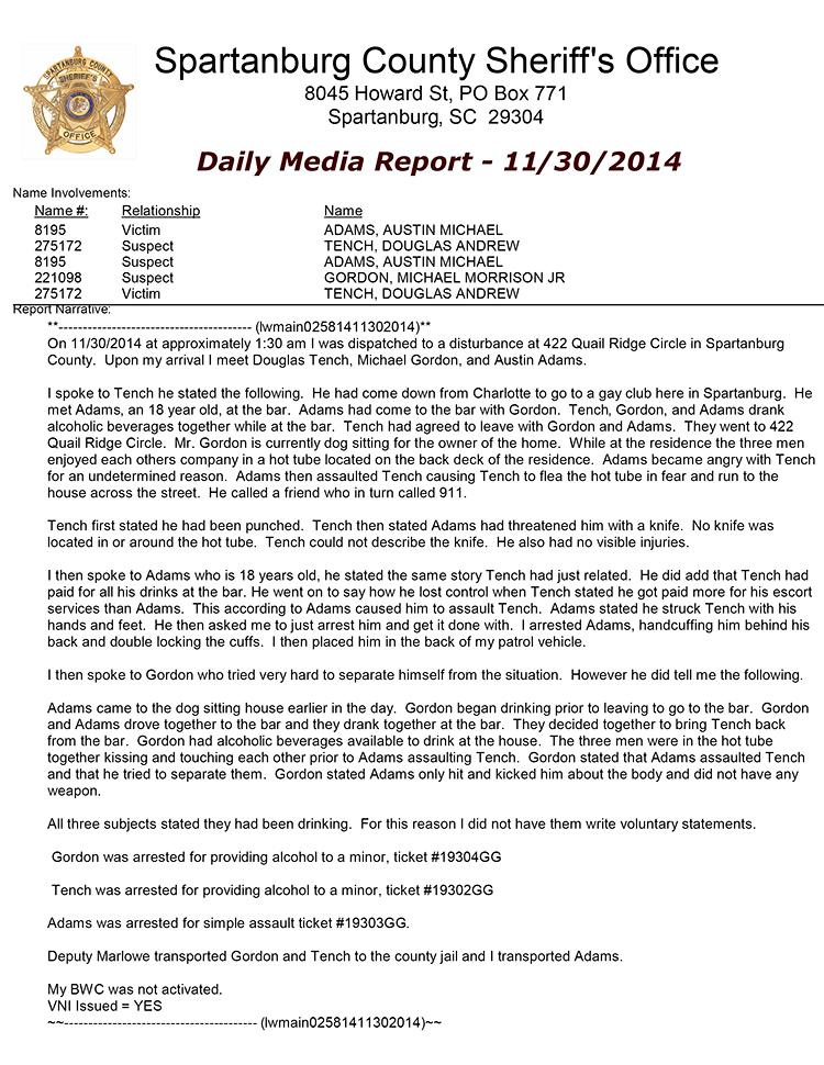 According to The New York Daily News, Tench came down from Charlotte, N.C. to hang out at a local gay club – where he met Gordon and Adams. The three wound up together in a hot tub which was located at – get this – a home where Gordon was “dog-sitting.”
