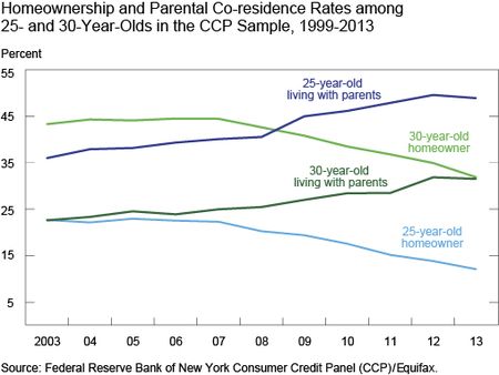 For twenty-five and thirty-year-olds, “parental co-residence increased steadily … from at least 2003 through 2012,” according to an analysis of the data posted to Liberty Street Economics (a publication of the New York Fed).