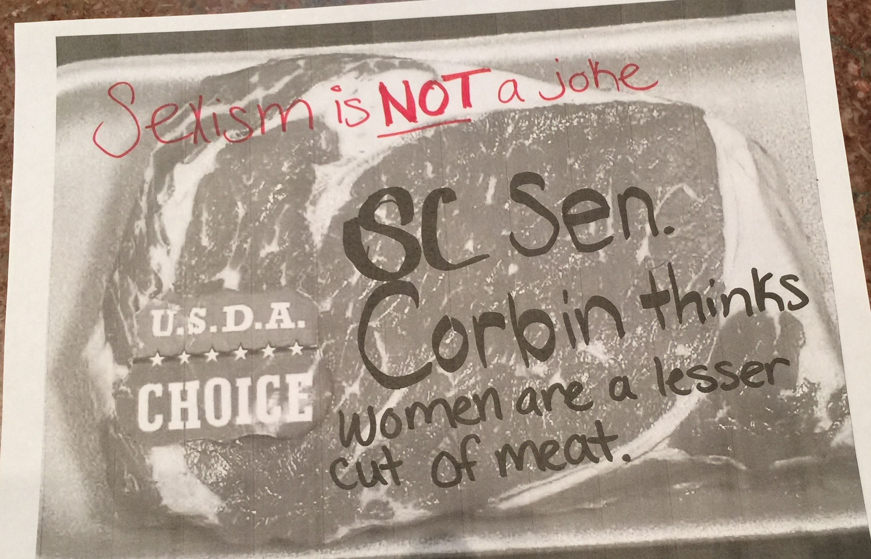 Last week, the Upstate “Republican” referred to his only female colleague in the State Senate as a “lesser cut of meat.” In fact the comment – a bastardized reference to the Biblical account of creation – was actually applied by Corbin to all women.