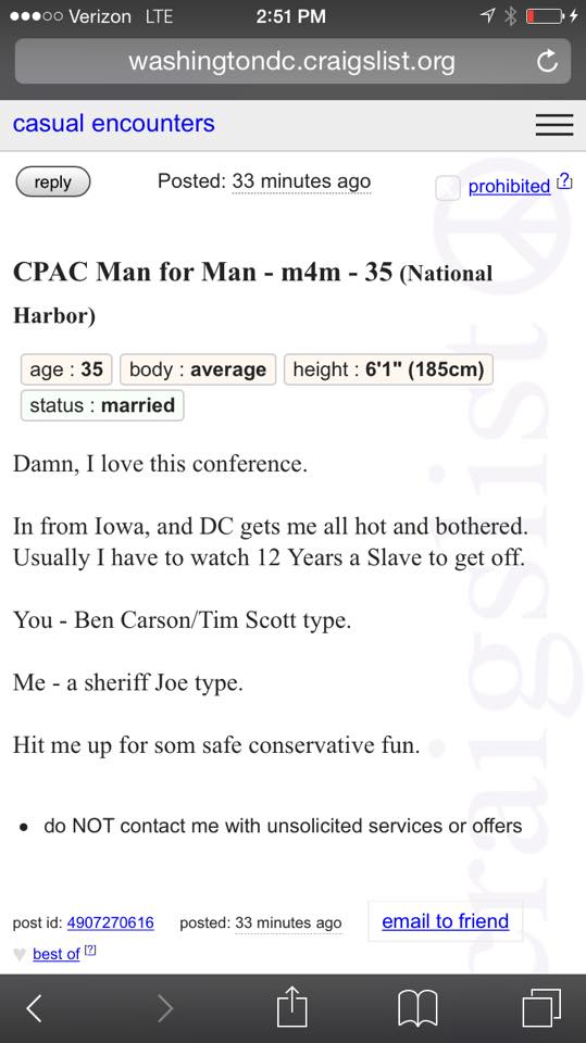 If Curtis Loftis is at CPAC then beware of a Craiglist post seeking a young man of college age or former military age that is well hung to come assist him with his needs.