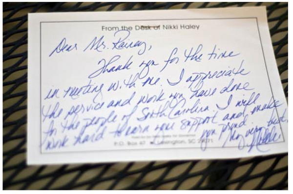 Come on will, an undated, random “thank you” note from Haley, most likely dated to when she was still a Sate House Rep as evidence that Rainey isn’t the