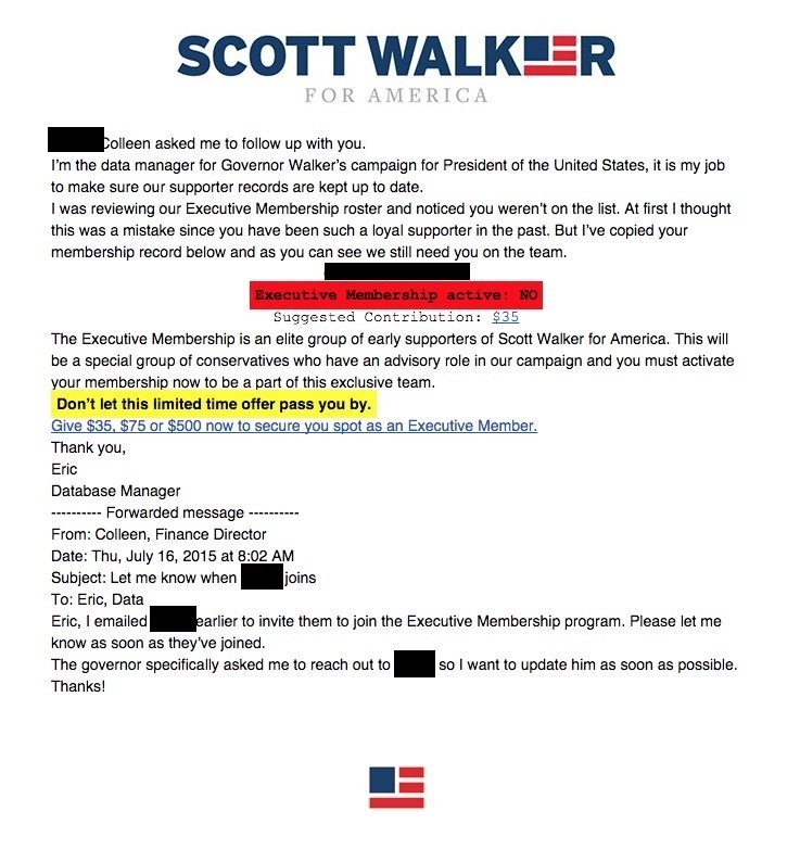 So yeah … according to this solicitation, Walker specifically asked his finance director (“Colleen”) about this recipient and is personally waiting to hear back as to whether “they” (not he or she) joined his “executive membership program” (i.e. paid his campaign $35).