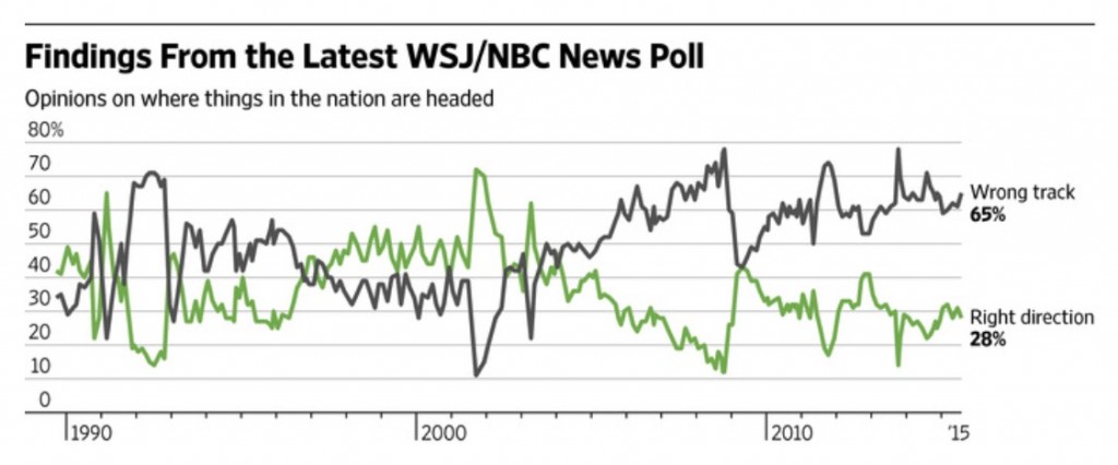 Earlier this week NBC News and The Wall Street Journal released their latest national polling. Among the results? A whopping 65 percent of Americans believe their country is on the wrong track.