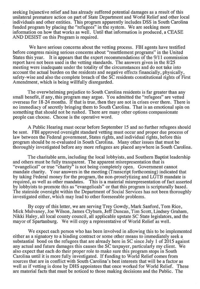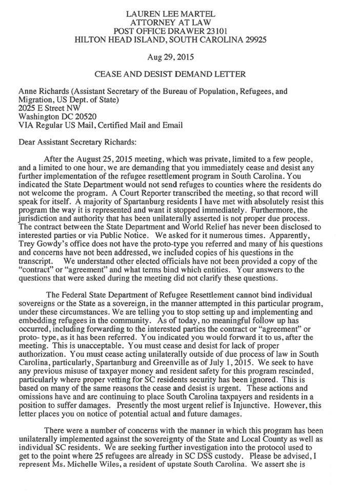 “We are demanding that you immediately cease and desist any further implementation of the refugee resettlement program in South Carolina,” the letter states. “You indicated the State Department would not send refugees to counties where the residents do not welcome the program. A Court Reporter transcribed the (private) meeting, so that record will speak for itself.”