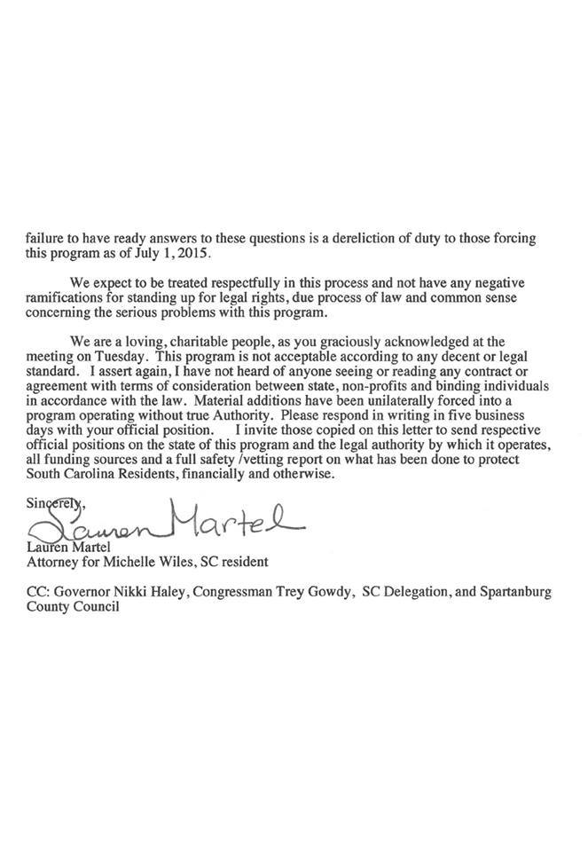 The letter goes on to say that the State Department is “acting unilaterally outside of due process of law in South Carolina, particularly, Spartanburg and Greenville as of July 1, 2015.”