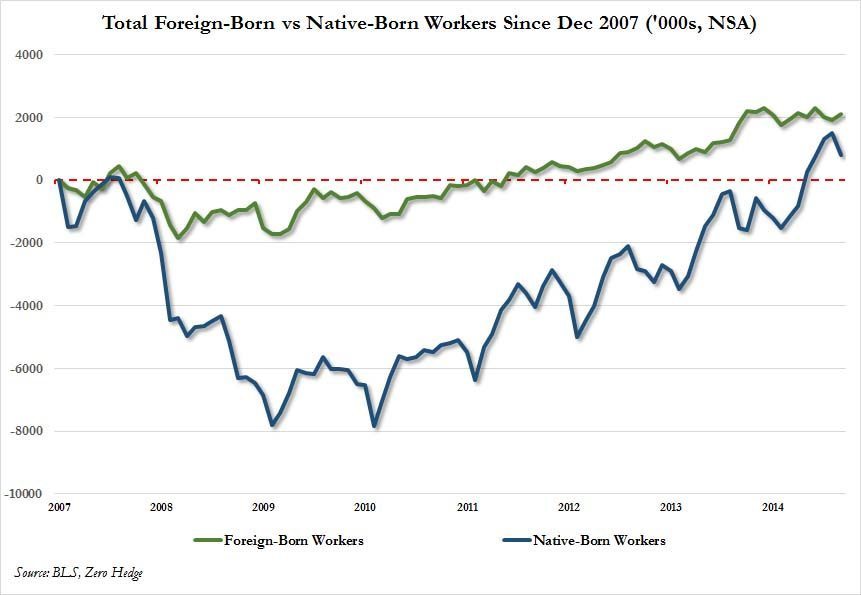 Since December 2007, native-born Americans have added only 790,000 positions in the U.S. economy. Foreign-born workers, on the other hand, have added 2.1 million positions.