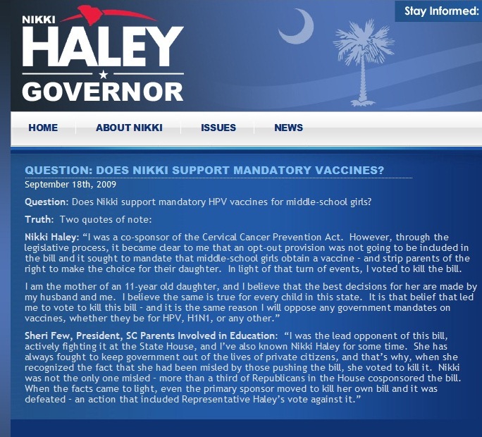 “Through the legislative process, it became clear to me that an opt-out provision was not going to be included in the bill and it sought to mandate that middle-school girls obtain a vaccine – and strip parents of the right to make the choice for their daughter(s),” Haley wrote on her campaign website in 2010. “In light of that turn of events, I voted to kill the bill.”