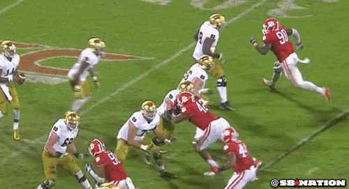 Don’t believe us? Take a look at this clip of Lawson manhandling the left side of the Irish line and forcing a holding penalty …