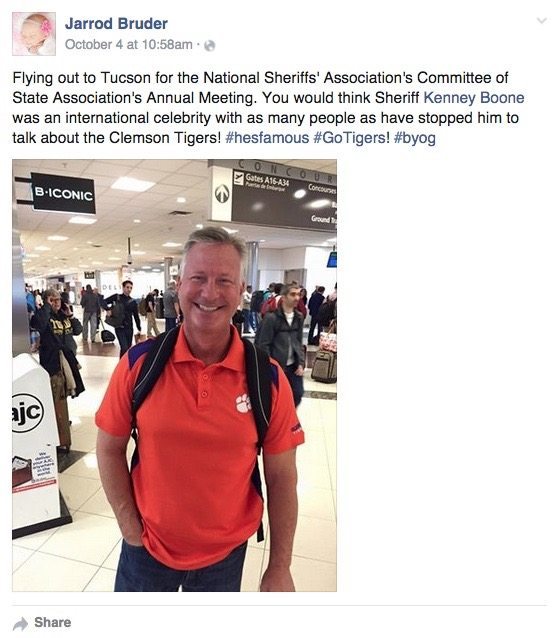 In fact Boone was photographed departing for the National Sheriffs’ Association meeting in Tucson, Arizona just before 11:00 a.m. on Sunday – as the worst of the crisis was beginning. Not only that, his smiling mug was posted to the Facebook page of Jared Bruder, the executive director of the S.C. Sheriff’s Association (who also made the trip).