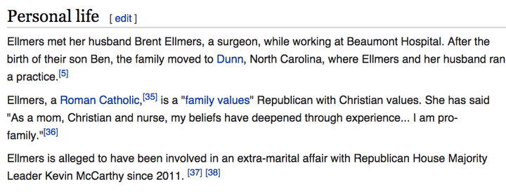 “Ellmers is alleged to have been involved in an extra-marital affair with Republican House Majority Leader Kevin McCarthy since 2011,” the edit to Ellmers’ page noted.