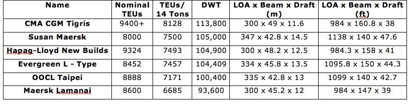 Look specifically at the Susan Maersk – which was the design vessel for the Cooper River Dredging project. The other vessels – though similar in terms of both weight capacity and TEU slot capacity – have design drafts of 2.6 meters to 1.0 meters less than the Susan Maersk. Of the vessels on the list, only the Evergreen L-Type ships and the OOCL Taipei and her sister ships are deployed to the east coast – and they generally arrive and depart drawing around 42 feet of water.