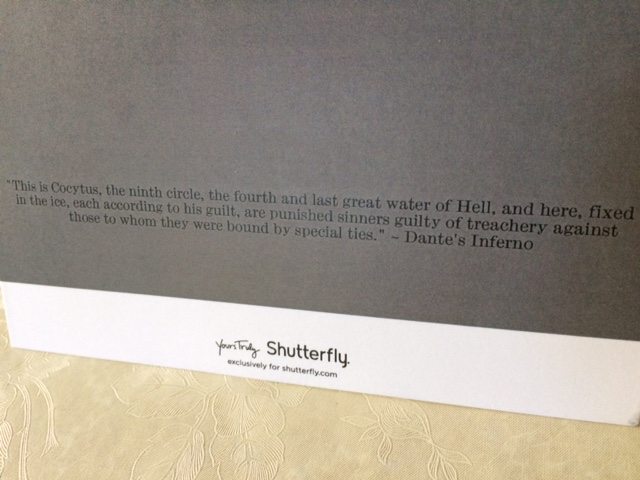 Driving Corley’s point home even further? A quotation on the back of the card from Dante’s Inferno describing the frozen lake of Cocytus – the ninth circle of hell.