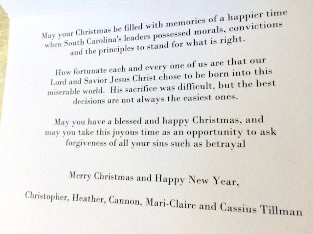 Corley’s card blasts lawmakers for their “betrayal” on the flag issue – urging its recipients to remember “a happier time when South Carolina’s leaders possessed morals, convictions and the principles to stand for what is right.”