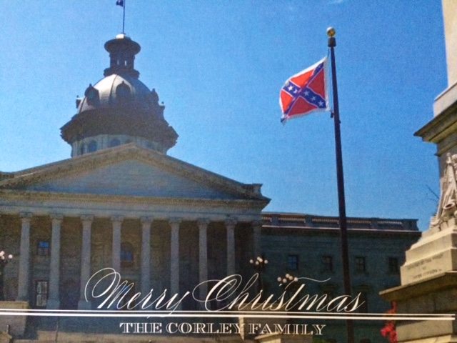 Corley’s card – mailed this week – features a picture of the controversial banner still flying from the north lawn of the S.C. State House.