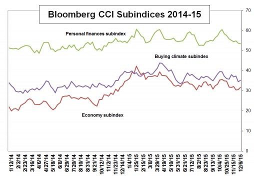 The Bloomberg Consumer Comfort Index was little changed at 40.1 in the period ended Dec. 6 from 39.6 the prior week. Even with the slight gain, the gauge remains below this year’s average of 43.