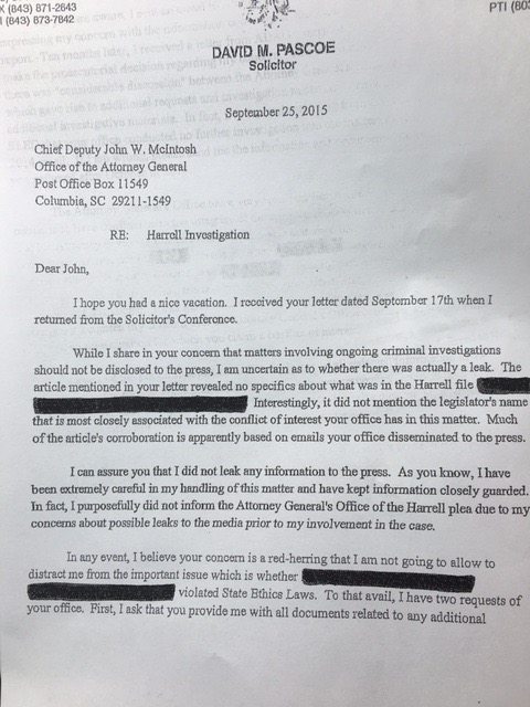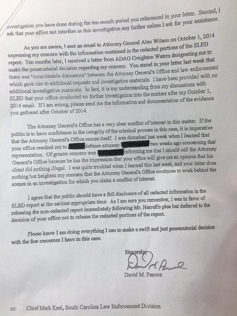 Take a look at this September 2015 letter to Wilson’s office by S.C. first circuit solicitor David Pascoe, who was assigned by Wilson last summer to handle the case after the attorney general recused himself citing undisclosed conflicts of interest.