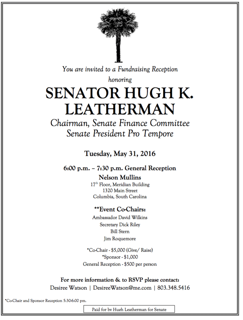 Several of the Palmetto State’s top political players are hosting a fundraiser for uber-liberal S.C. Senate president Hugh Leatherman at a ritzy downtown Columbia, S.C. law firm later this month.