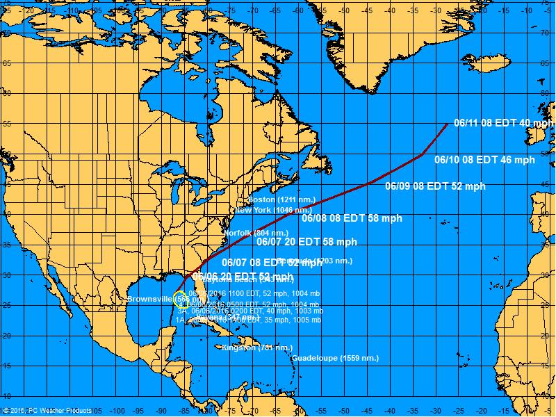 As of 10:00 a.m. EDT on Monday, Colin was located about 285 miles west-southwest of Tampa, Florida. The storm was packing maximum sustained winds of 50 miles per hour and headed north-northeast at 16 miles per hour. Tropical storm force winds extended outward 230 miles from the center of the system.