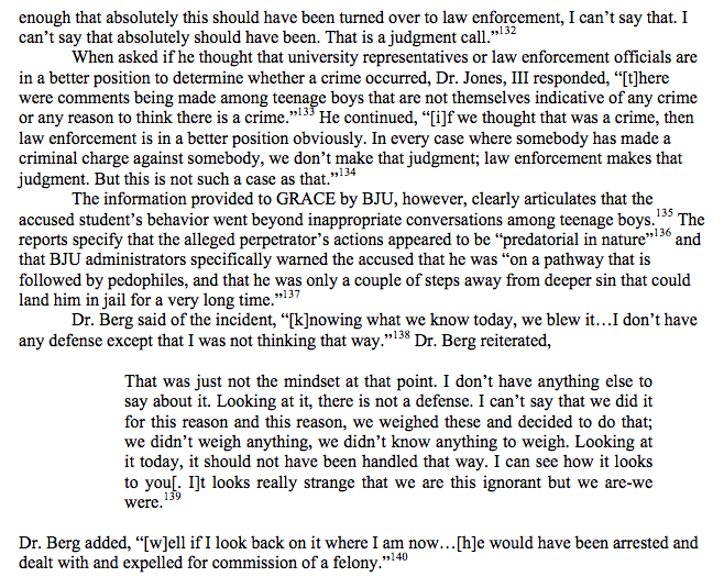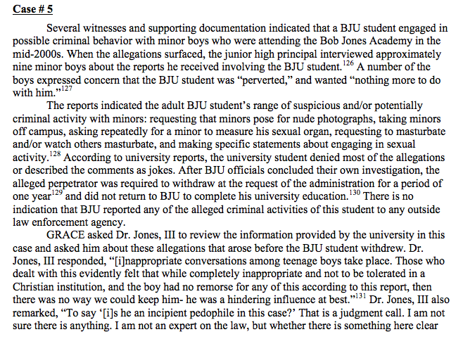 Actually, the school’s former president Bob Jones III is on the record in the Grace report saying a “judgment call” was made not to report one alleged case of such activity the police.