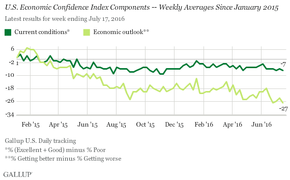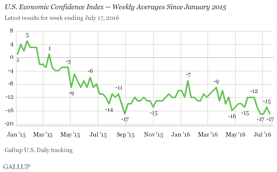 “During the slow recovery from the worst recession since the Great Depression, Americans’ assessments of the economy became slightly more positive than negative from late December 2014 to mid-February 2015,” its pollsters noted. “However, those positive sentiments faded throughout the spring and summer of 2015. Confidence slowly inched up in late 2015 and early 2016 as gas prices plummeted nationally, but confidence dipped in mid-April and again in mid-June.”