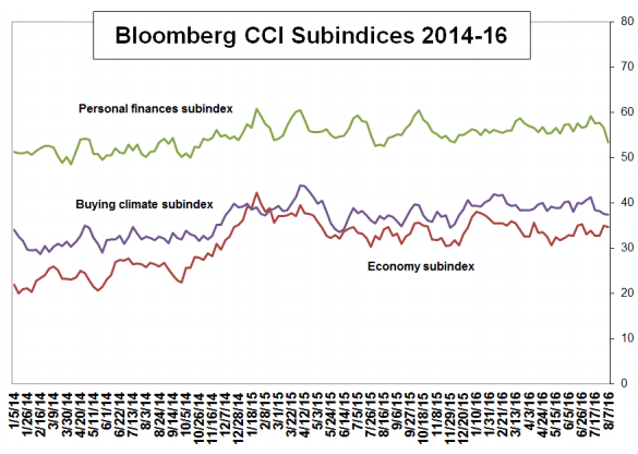 For those of you keeping score at home, the CCI has been compiled weekly since December 1985 by Langer Research Associates. The index’s record high of 69 was reached on January 16, 2000. Meanwhile its record low of 23 has been recorded on four separate occasions – most recently on June 21, 2009.