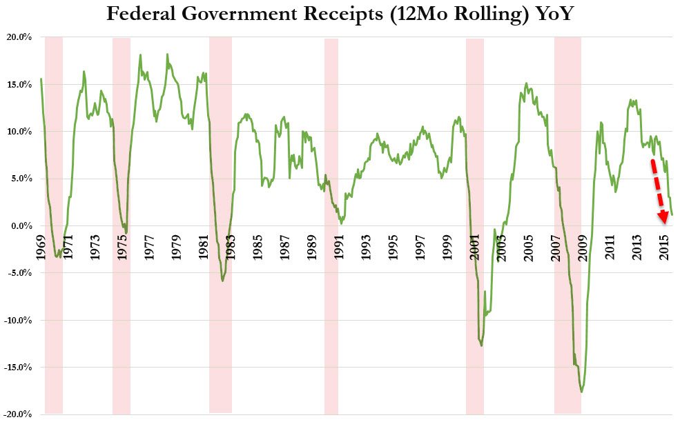 “U.S. tax receipts have never done this without a recession,” the website warned, adding that “the last six times tax receipt growth was at this weak a level, the American economy was (already) in recession.”