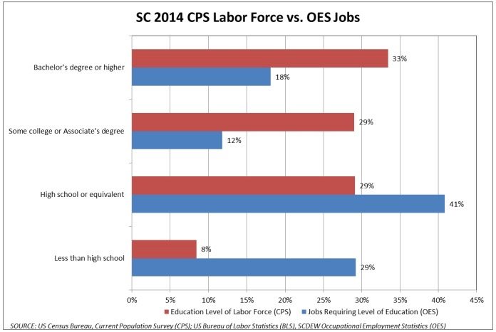 That’s right. According to SCDEW, 33 percent of the state’s workers have earned a bachelor’s degree (or higher). Unfortunately for them, only 18 percent of the state’s jobs require that level of training. Similarly, 29 percent of the state’s workforce has “some college” education or an associate’s degree – but only 12 percent of the state’s jobs require that level of educational attainment.