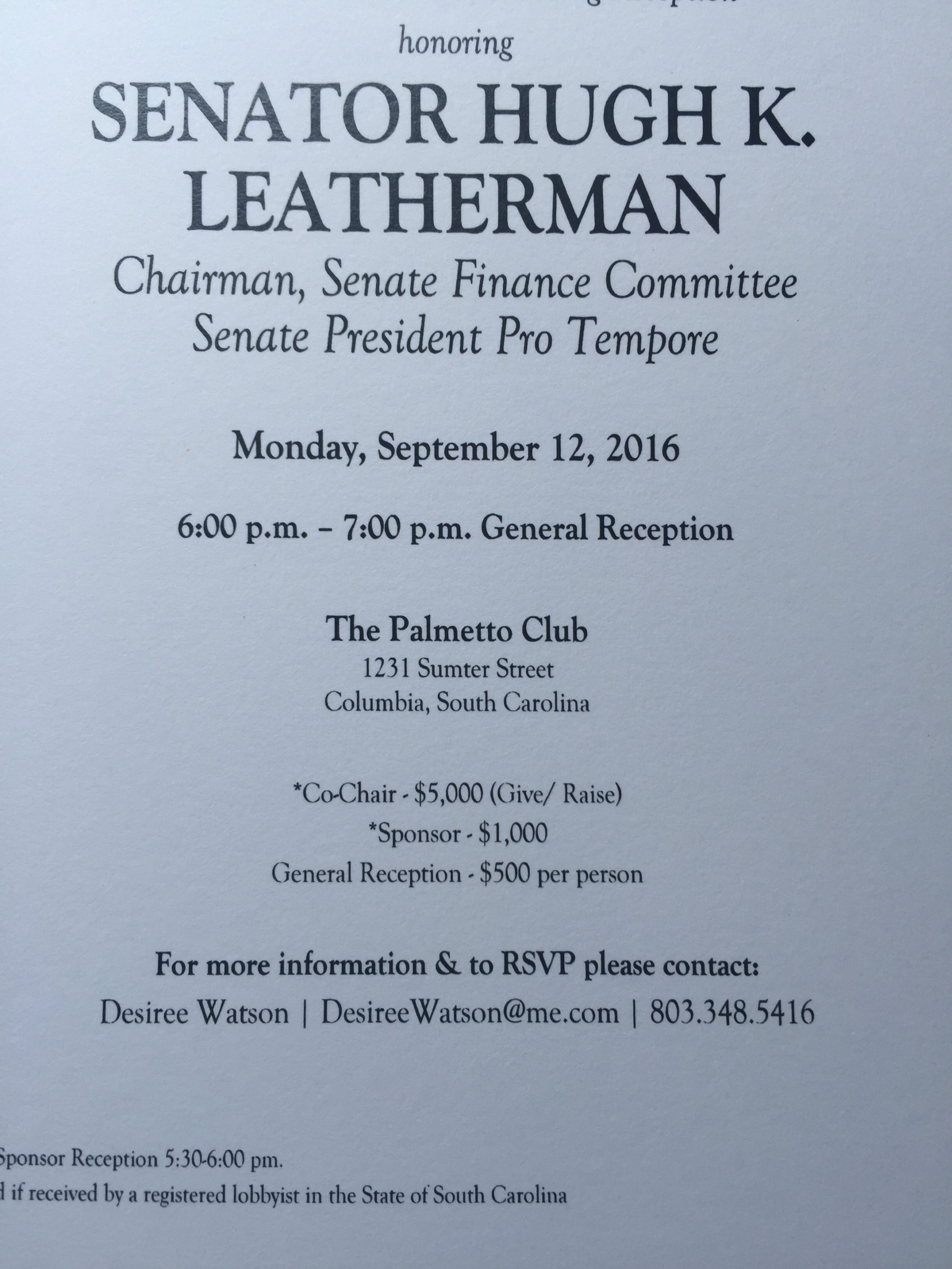 As you can see from the above invite (which features a not-so-subtle reminder of Leatherman’s position as Senate finance committee chairman), the diminutive liberal is looking to rake in some serious cash next month.